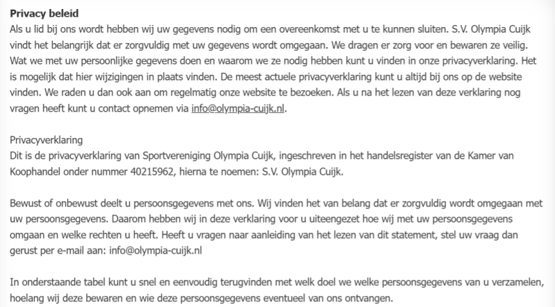 | Administratie | - Voornaam - Achternaam - Adresgegevens - E-mail adres - Telefoonnummer - Geboortedatum - Bankgegevens | Uitvoering van de overeenkomst | Gedurende de looptijd van de overeenkomst en tot 2 jaar daarna. Na beƫindiging van uw lidmaatschap alleen in de financiƫle administratie voor 7 jaar | - Ledenadministratie - Penningmeester |