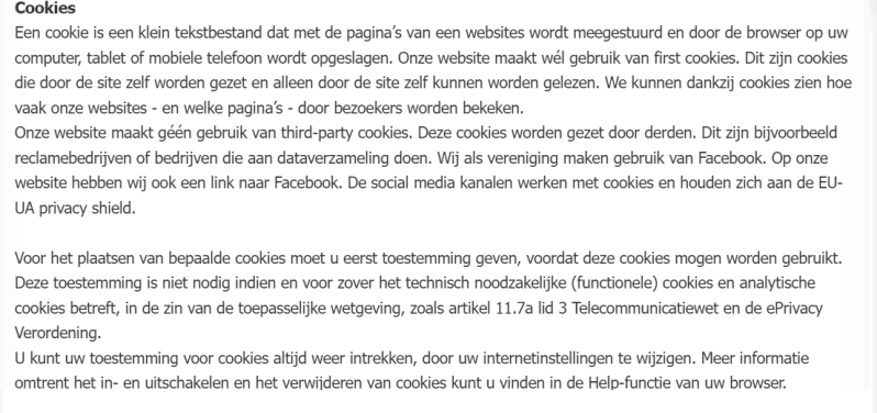 | Website/facebook: het plaatsen van informatie over evenementen. Sfeerimpressies van een les of evenement. | - Foto - Video | Toestemming | Iedere keer dat onze website bezocht wordt. Deze gegevens worden zo snel als mogelijk geanonimiseerd. | - Iedereen die deze kanalen bezoekt. |